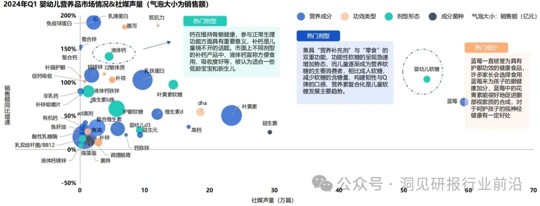 从剂型、成分、功效等热门概念来看,大部分成分在销售端的表现领先于认知端,同比增幅均较高。社媒端的讨论方面更多集中于常见的成分和一些新兴的剂型,如婴幼儿软糖、蓝莓等。