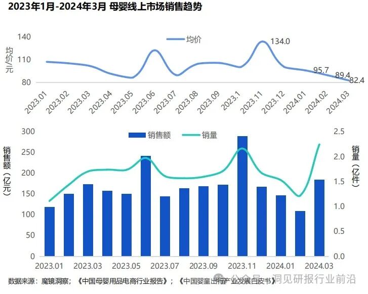 2024年Q1,母婴线上渠道销售额为440.2亿元,同比减少0.6%,整体市场基本稳定;但从均价来看,受到23年产能剩余,经销商货物积压销售压力大,部分消费者价格敏感度增强、育儿观念改变等因素的影响,母婴市场均价自2023年11月以来持续下滑,24年Q1同比下降约18.2%。