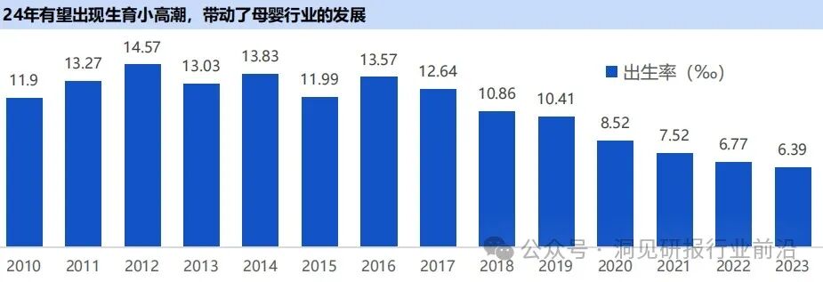 近年生育率出现下降趋势,2023年出生率仅为6.39 ‰ ,而2024年有望成为生育小高峰,一方面是由于疫情期间挤压的生育需求和23年增长的结婚登记数量,另一方面是中国人民对于龙年和“龙宝宝”的推崇,同时,21年至今,多项激励生育政策颁发,对生育意愿有促进作用。