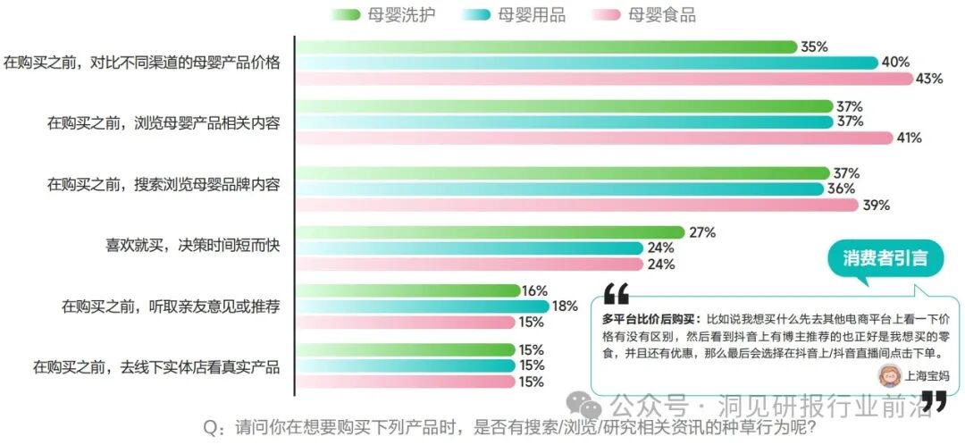 母婴消费者在购买食品、用品和洗护产品时更加仰赖于线上渠道获取资讯和比价。
