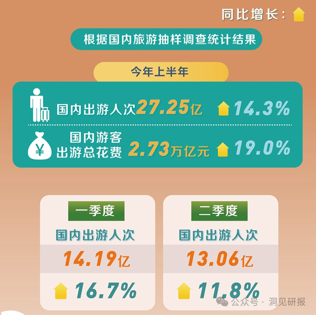 据中国文化和旅游部7月26日发布的2024年上半年国内旅游数据情况显示,今年上半年,国内出游人次27.25亿,同比增长14.3%;国内游客出游总花费2.73万亿元,同比增长19.0%。