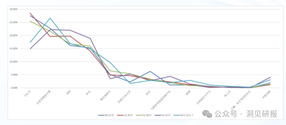 从“哈尔滨冰雪大世界”,到“淄博烧烤”,再到“天水麻辣烫”,相关事件兴起的背后离不开社交媒体和年轻用户群体的共同推动。通过社交平台上的分享、转发、打卡、追风等行为,年轻消费群体已实现了对旅游消费热点的形成、推动与主导。从信息获取渠道分布情况来看,小红书成为了影响40岁以下用户最大的渠道,而百度等搜索引擎在41岁以上用户中占据优势。