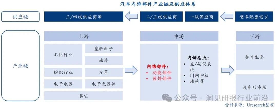 内饰部件处于汽车产业中游的零部件制造部分,属于汽车制造核心环节之一。内饰部件制造核心原材料包括塑料粒子、油漆、皮革、电子元器件等。