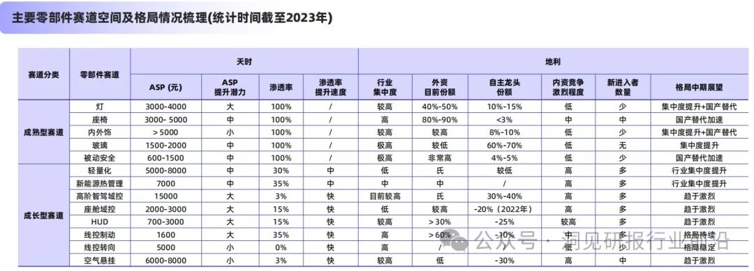 基于汽车零部件存量和增量客户结构好,参考业绩确定性的优质零部件企业,零部件分成熟型赛道:大内饰、车灯、座椅、玻璃、被动安全。成长型赛道中,智驾及座舱域控、线控制动、线控转向、HUD、空悬、轻量化、热管理。
