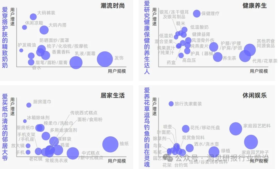 银发用户比重日益增大,且近年来在电商领域展现出强劲的消费潜力,成为电商平台新增量的趋势人群之一。他们的消费特点与需求日益多样化,不仅限于传统的生活用品,还涵盖了健康护理、旅游度假和休闲娱乐等多个方面。