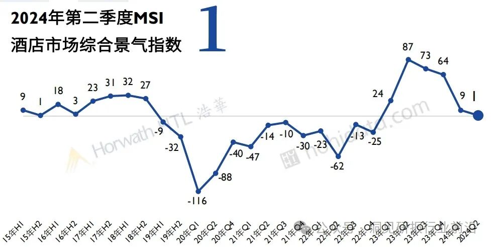 2024年第二季度中国酒店市场景气指数为I。自今年一季度开始,景气指数已回归至2020年以前的市场水平。