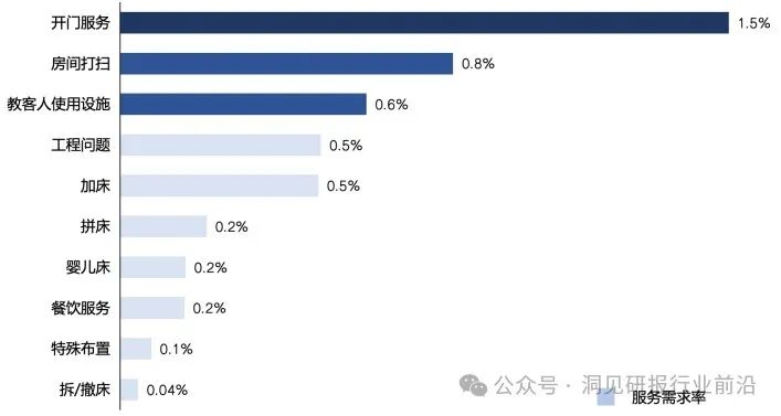 开门服务是最高频需要的服务,酒店可从下单人、房卡、门锁等多角度了解原因,从而寻找可优化该服务的方法;教客人使用房间设施,一般多和空调及电视有关,还会涉及到淋浴,马桶等其他客房配备的产品,酒店可考虑在合适的位置添加指引,或者在check in或其他服务环节为客人提前做相关介绍。