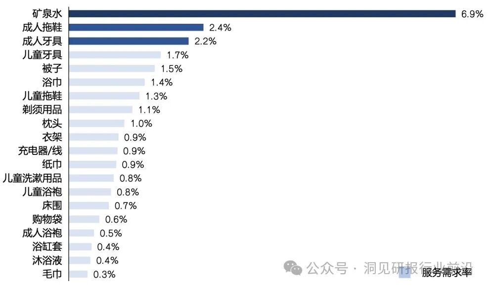 酒店客人最常需要的物品是水,各类儿童用品的总量排名第二。
