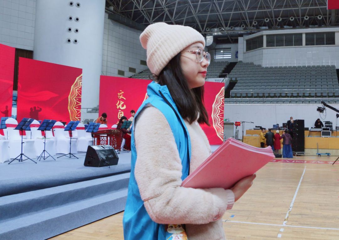 上午7:50,志愿者们准时在佑铭体育场集合,在负责人老师的带领下,志愿者们进入演出场地,被有序分配到布置场地、分发节目单、引导表演人员等岗位,提前一小时为演出做准备。由于舞台和观众席需要的椅子比较多,志愿者们需一把一把搬过去摆好,在这个过程中,每个人都参与其中并相互协助完成任务;老人陆续到场后,分发节目单的志愿者在指定位置站好,分发给观看演出的老人;同时,为防止老人们在上台时发生拥挤磕绊现象,引导志愿者细心提醒及引导。
