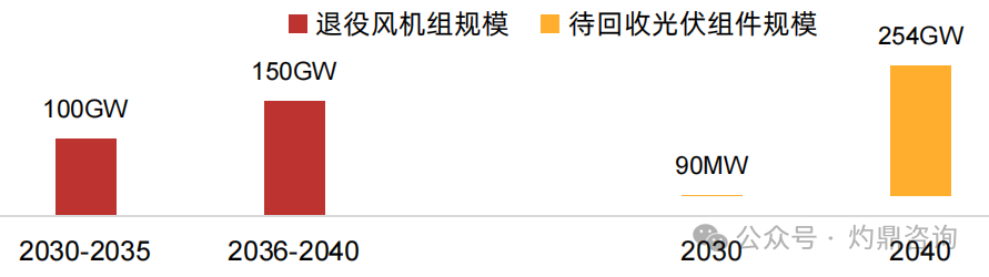 风光设备集中退役,关键组件处置体量大。2025-2035年,预计风电和光伏设备循环利用市场总额将超过1500亿元。预计到2025年,我国将迎来第一批大规模退役风电机组(1.2GW),到2030年,我国进入光伏组件报废密集期。