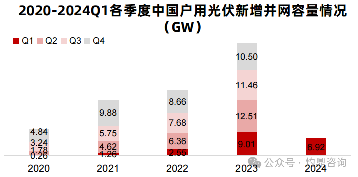 集中式和分布式光伏新增并网容量分别占比55.48%和44.52%。2023年新增并网光伏发电容量达到了216.3GW,其中集中式光伏电站新增了120.014GW,分布式光伏系统则新增了96.286GW。