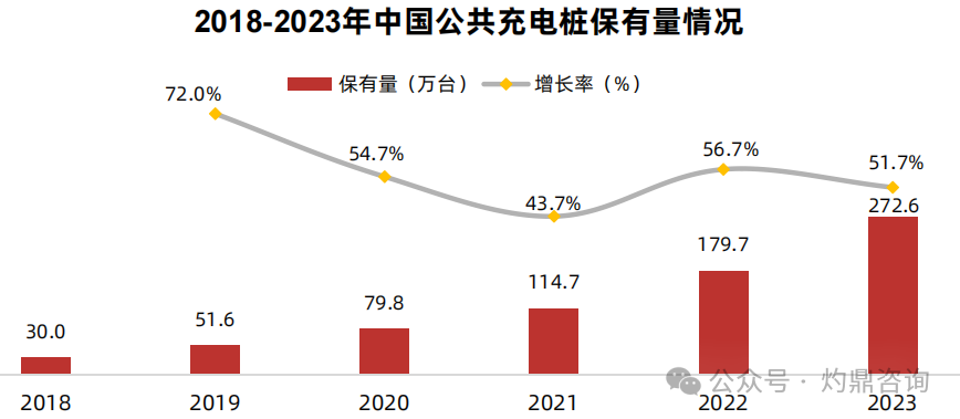 中国充电基础设施建设快速推进,以满足日益增长的充电需求。2018年至2023年,中国公共充电桩保有量不断增加,年均复合增长率达55.51%。
