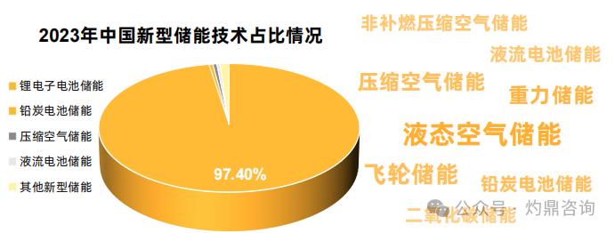 锂离子电池储能占绝对主导地位。2023年,中国已投运锂离子电池储能占比97.4%,铅炭电池储能占比0.5%,压缩空气储能占比0.5%,液流电池储能占比0.4%,其他新型储能技术占比1.2%