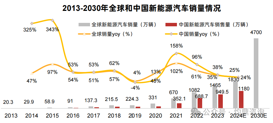 全球新能源汽车市场蓬勃发展。2013年至2023年,全球新能源汽车销量稳步攀升至1465万辆,预计2030年将增长至4700万辆。中国新能源汽车市场自2020年起增长尤为迅猛。2023年新能源汽车销量达949.5万辆,占全球份额64.8%,预计2024年有望增长至1180万辆,首次突破1千万辆。