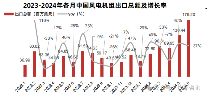 近年来,中国风电产业正以强劲势头拓展海外市场,出口容量保持高速增长,其中,陆上风电主导外销格局,海上风电初露锋芒。风电机组出口总额屡创新高。在政策改善和技术创新推动下,2024-2025年有望迎来海上风电装机小高峰。