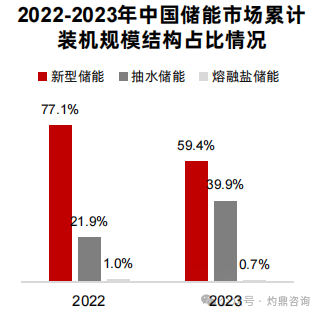 中国新型储能市场快速发展,技术结构优化升级。2023年,中国储能累计装机功率约为83.7GW,已投运装机超3000万千瓦。其中,新型储能贡献最大(占比59.4%),累计装机功率约为32.2GW,同比增长196.5%。抽水蓄能占储能装机总量的39.9%,累计装机功率约为50.6GW,同比增长10.6%。