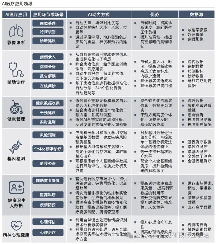 随着技术的不断革新,AI医疗已广泛应用于多种领域,包括影像诊断、辅助诊疗、健康管理、基因检测等,在提高精准度与效率、个性化治疗、数据处理等方面具备显著优势。