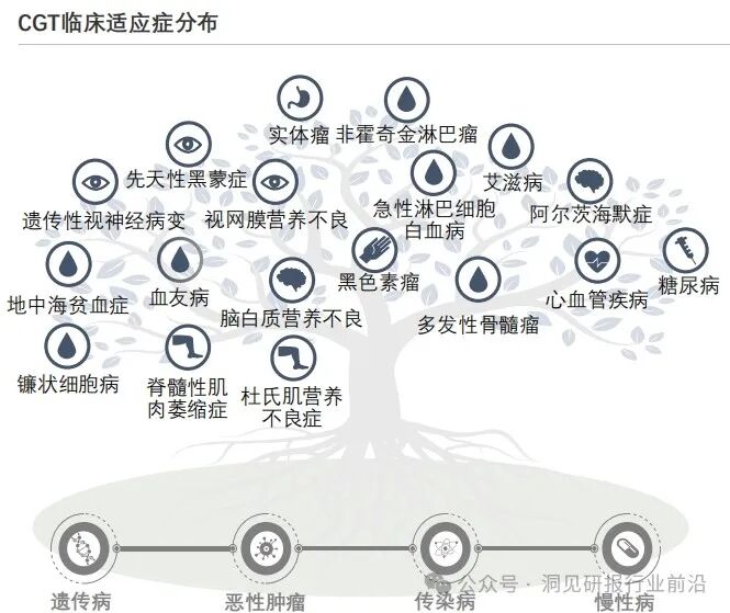 CGT临床试验应用领域逐渐扩大,对于糖尿病、心血管等慢性疾病以及艾滋病等传染性疾病的应用也在增加,为这类疾病的治愈带来希望。CGT从最初的主要应用于探索针对遗传性疾病治疗,发展至今正广泛应用于恶性肿瘤、感染性疾病、心血管疾病以及自身免疫性疾病的治疗。