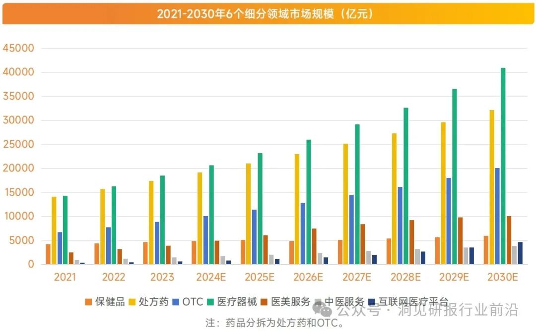 2023年我国人均医疗保健消费支出2460元,同比增长 16%。而从6个细分领域的市场规模看,医疗器械、处方药和OTC的市场规模占据前三。