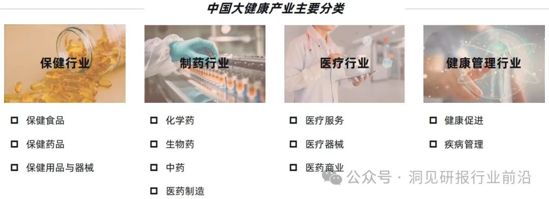 大健康是健康概念的延伸,它围绕着人类衣食住行、生老病死等一系列活动而展开,贯穿于疾病预防、诊治护理以及保健管理的全生命周期。主要切分为四大板块:个护保健产业、制药产业、医疗产业、健康管理产业。