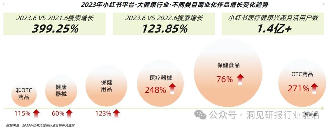 大健康行业旗下热门类目商业化进入增长的快车道,OTC&医疗器械赛道搜索量同比去年同期增长了2倍多;保健食品成大健康行业的主引擎,赛道入局品牌数量激增,推动行业良性竞争。