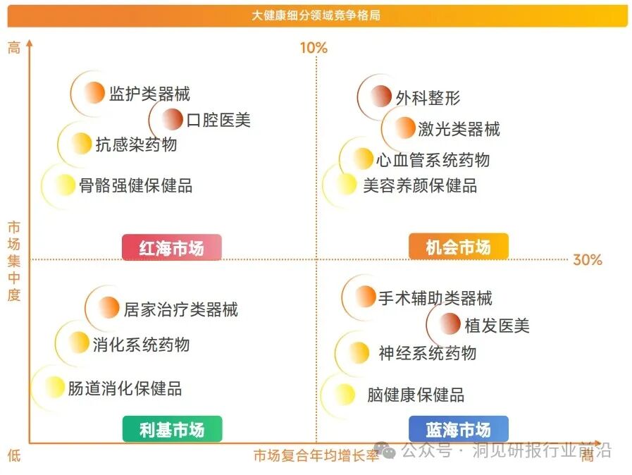 从市场竞争格局看,机会市场和蓝海市场细分品类潜在需求大。抗感染药物、监护类器械市场趋于饱和,脑健康保健品和植发医美市场潜力大。