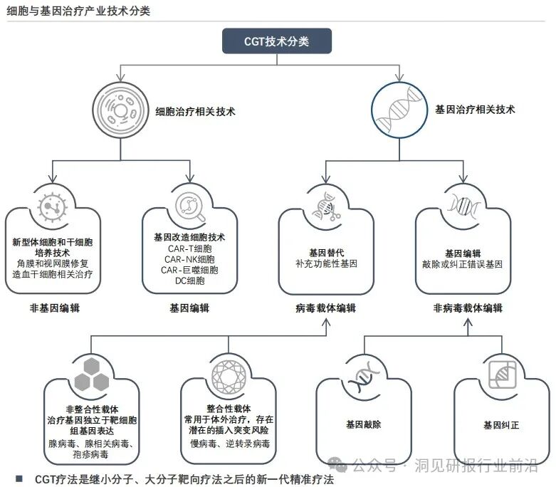 CGT是依托于细胞治疗与基因治疗技术发展的医药领域新兴行业,通过对患者进行细胞治疗和基因治疗,能够以细胞和基因作为载体,直接对造成患者疾病的根源进行治疗。