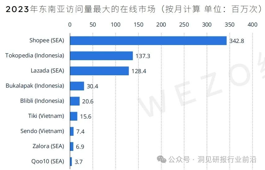 2023年,Shopee的月访问量为3.428亿,是东南亚在线市场中访问量最高的。印度尼西亚在线市场Tokopedia紧随其后,2023年的月访问量超过1.37亿。