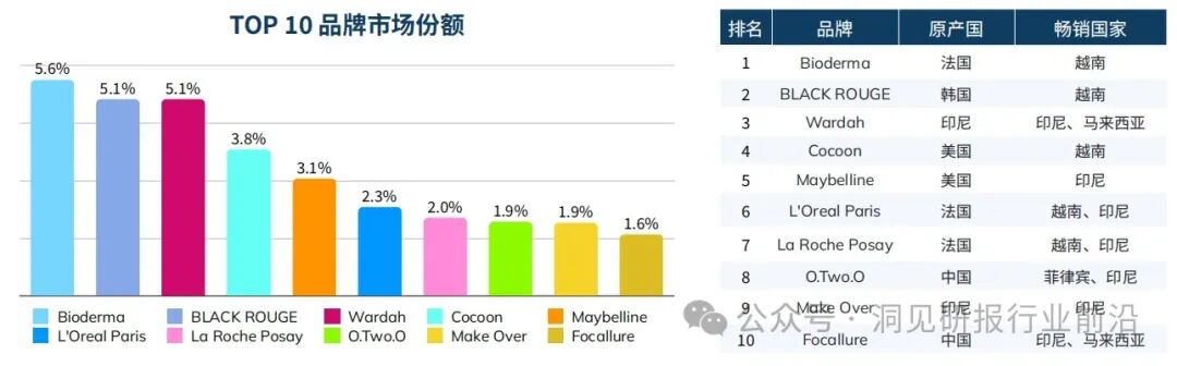 总体来看,亚洲品牌在东南亚市场更受欢迎。前十名榜单中,有八个品牌来自亚洲,其中六个品牌来自东南亚国家,泰国和印尼品牌尤为