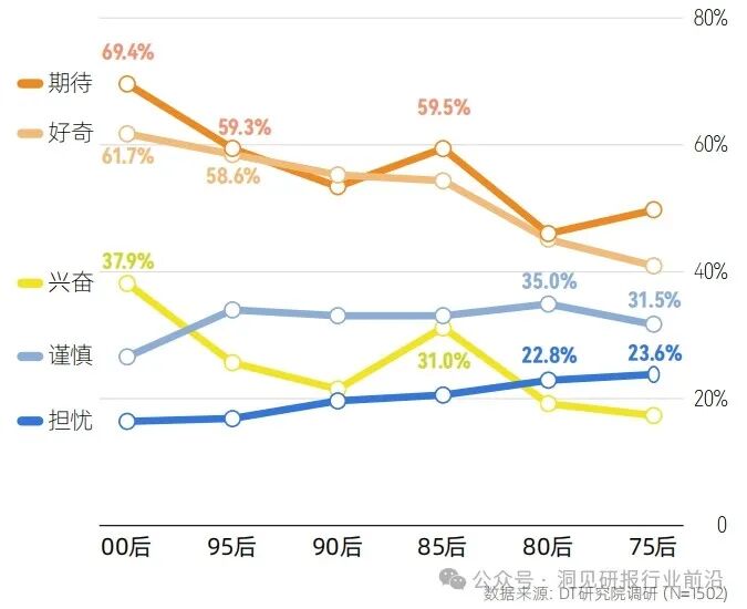80后和75后则更保守,他们选择谨慎和担忧的比例更高。