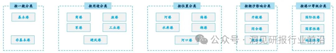 目前港口有多种分类方式,主流分类包括一般分类、按功能用途分、按地理位置分、按潮汐影响分、以及按港口等级进行分类。
