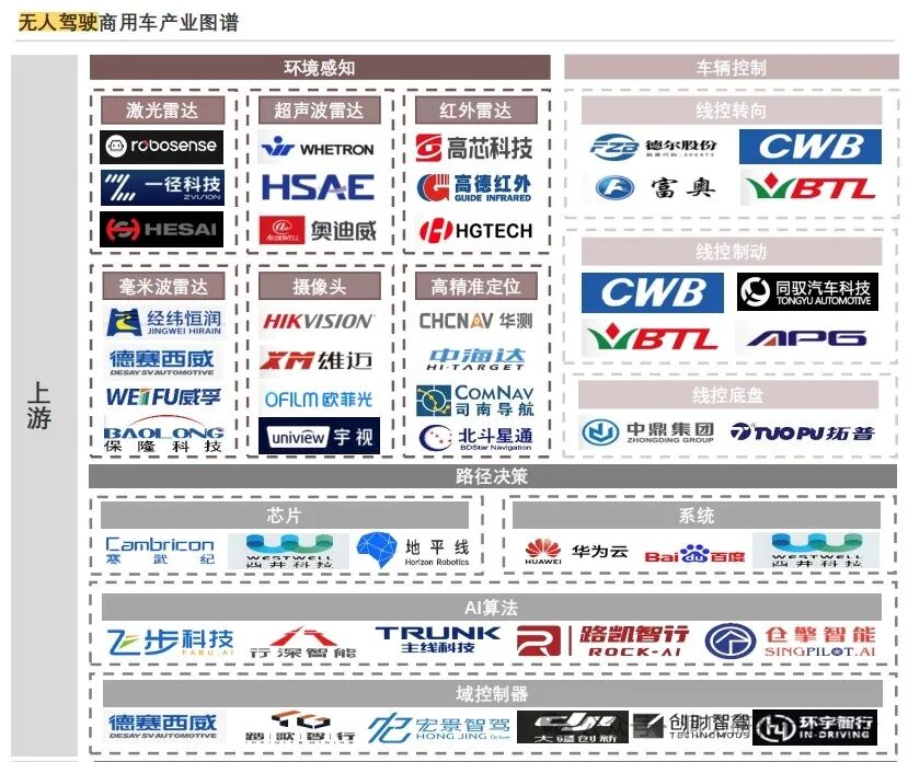 无人驾驶商用车产业的核心环节在于上游零部件及系统,上游环境感知环节中摄像头及雷达等传感器领域未来发展迅速。