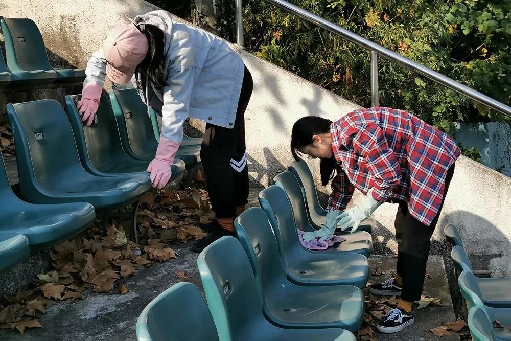 此外,志愿者佘香霖发现部分座位上张贴有难以除去的广告纸,用水浸湿后仍然不能剥落。在和负责人员沟通后,她回寝室拿了钢丝球,成功地擦掉了有碍观瞻的“牛皮癣”。化学学院青年志愿者协会实践部部长邱怡薇发现有位志愿者想“走捷径”——翻阅观众席的栏杆来捡拾垃圾。她立即阻止了该志愿者,在对她全心全意力求做好清洁的初衷予以肯定的同时特别强调了安全的重要性。