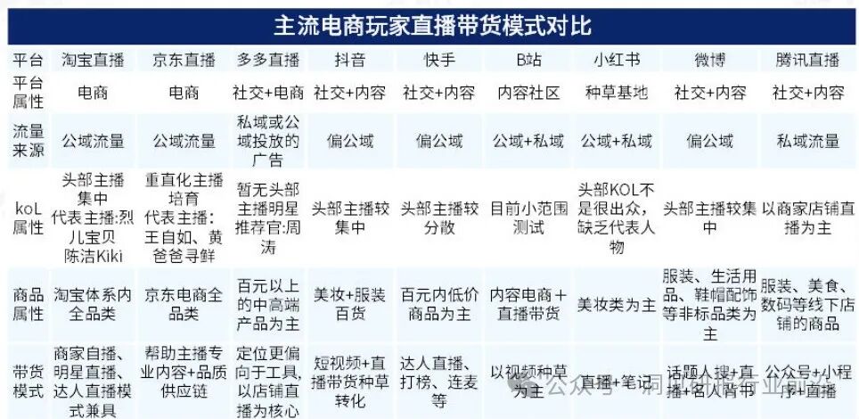 当前主流直播电商玩家有淘宝直播、京东直播、多多直播、抖音、快手、B站、小红书、微博、腾讯直播,各平台直播带货模式不尽相同。