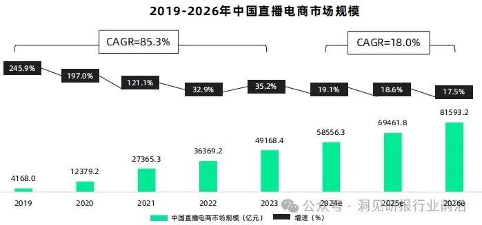 2023年中国直播电商市场规模达4.9万亿元,同比增速为35.2%。相较于行业发展早期,行业增速出现一定下滑,但仍维持较高的增速水平。