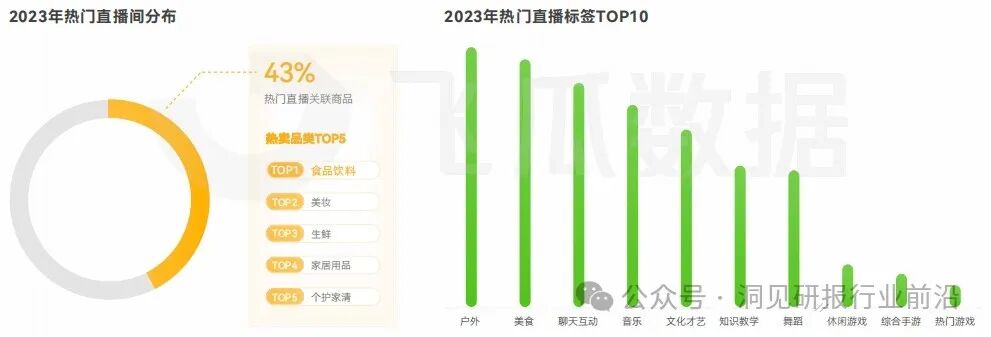 从热门直播的标签分布来看,户外、美食、聊天互动通常具有较强的娱乐性和参与性,能够吸引更多的观众的关注和参与,成为热门直播标签前三。而在热门直播间中,43% 的直播间属于带货直播,这些直播间的热卖品类主要集中在食品饮料、美牧和生鲜等快消品领域。