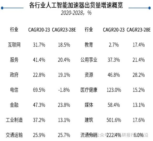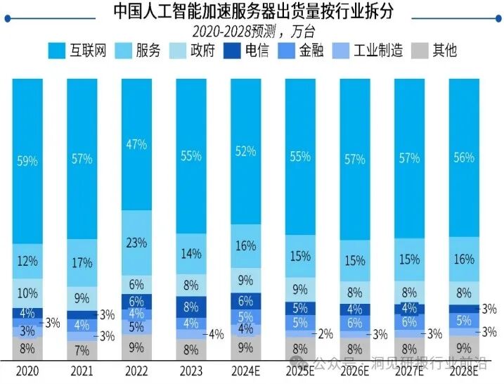 互联网一直处于大模型训练和推理领域的第一梯队,占据每年人工智能加速服务器市场的半壁江山,随着垂直行业大模型的逐步渗透和商业化落地,金融、能源、交通运输、教育、政府和智能制造等板块对智算资源的需求将逐渐凸显。
