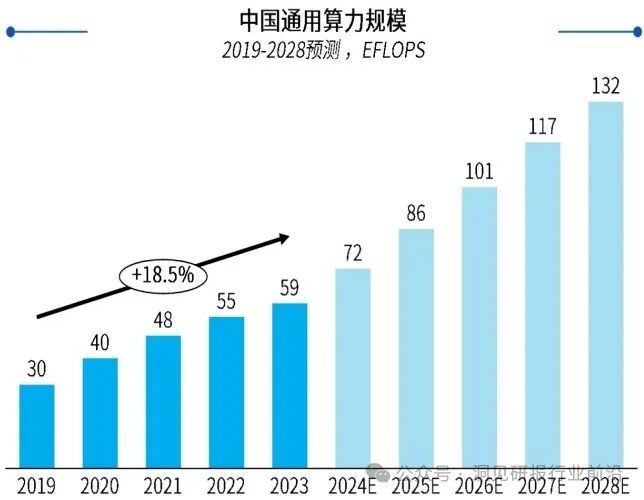 2023年中国通用算力规模达到59EFLOPS,2019至2023年的年复合增长率达到约19%,通用算力因其复杂任务处理能力以及高适应性使其有广泛的应用场景,但难以适应大模型训练的需求。