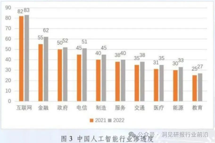 智能算力在行业应用情况可根据人工智能的行业渗透度来分析,与2021年相比,各行业人工智能渗透度明显提升。