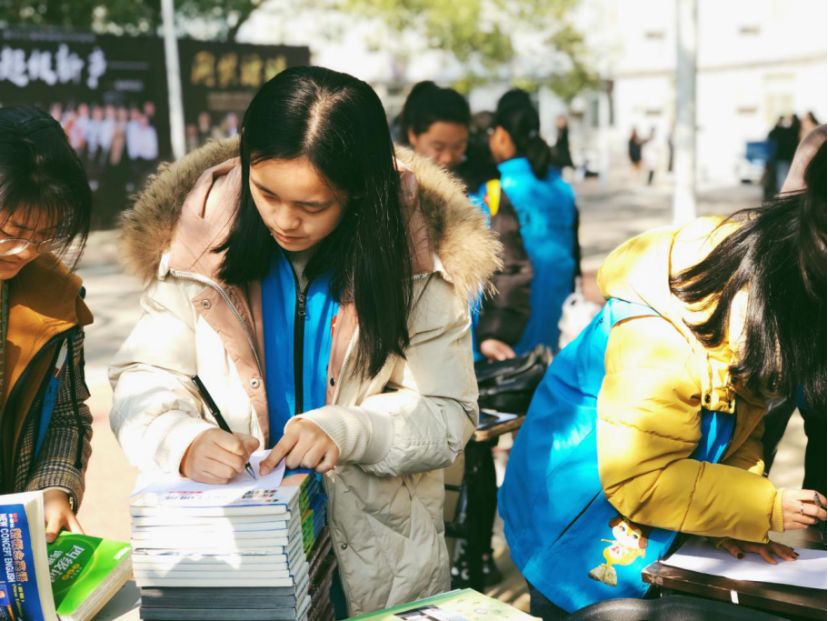 志愿者们一起将收集到的旧书进行清点和分类摆放,各司其职,有条不紊。