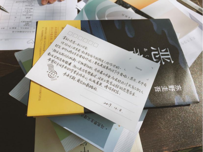 值得注意的是,有一位善良的小姐姐在自己捐赠的《恶意》一书上,贴心地附上了一张自己亲手写的明信片。“未来可期,爱会如影随形”。她希望,在远方打开这本书的孩子能够永远开心,永远善良。她爱这本书,也希望将这份爱继续传递下去。