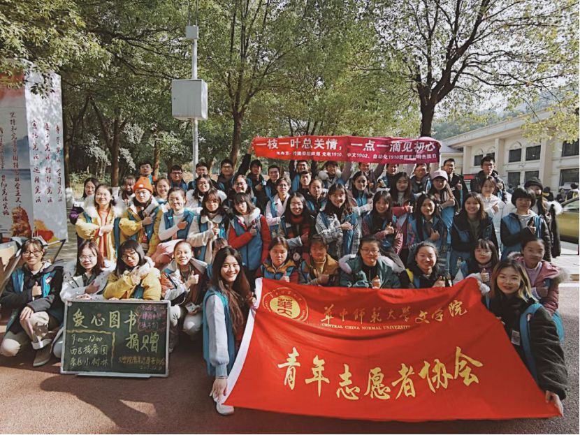 活动圆满结束后,华中师范大学文学院青年志愿者协会成员、华中科技大学中文1902、自动化1910班志愿者以及文学院公师1903班志愿者们合影,手举活动横幅和协会旗帜,右手比出志愿者手势,面对镜头绽放出灿烂的笑容。