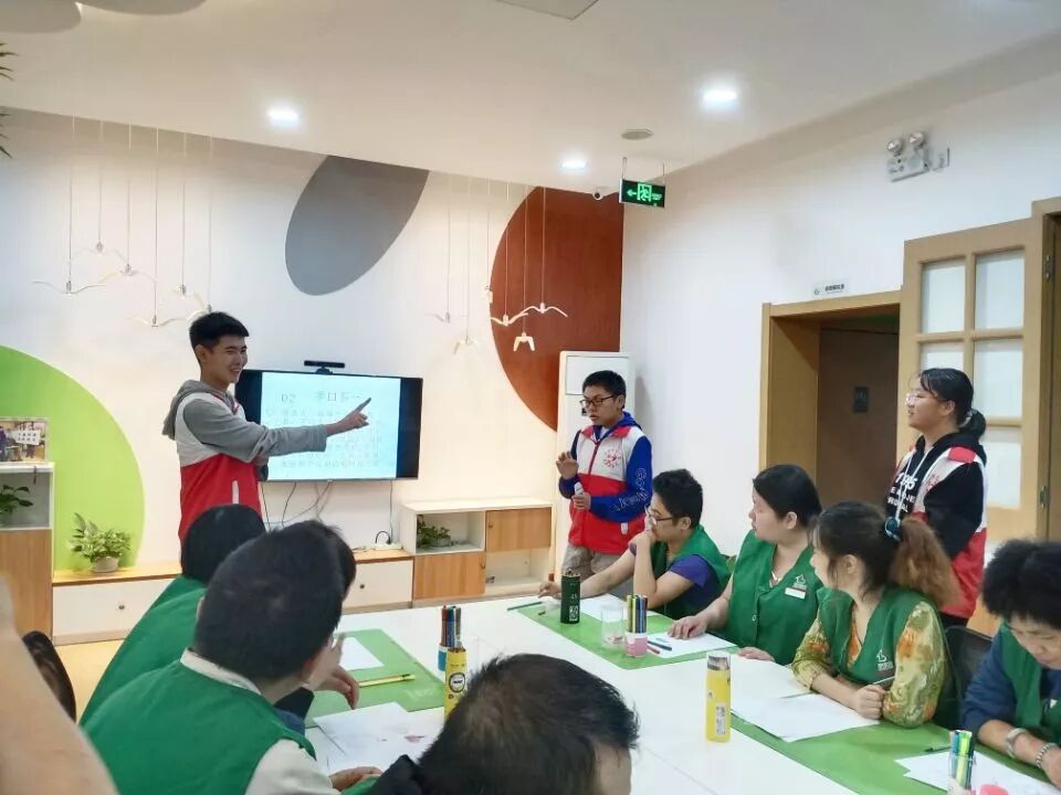 志愿者们来到阳光家园时,残疾人朋友们已经整齐地坐着等待活动的开始。初次见面,志愿者们向残疾人朋友们一一进行了自我介绍。志愿者褚予汐首先为残疾人朋友们朗诵诗歌并对诗人余光中的生平进行简要介绍。接着便是游戏环节。第一个游戏是简笔画。在准备画苹果时,志愿者先在黑板上画了个圆,一位残疾人朋友忽然说了句:“我怎么觉得你画的不像苹果。”接着便在自己的纸上画起了苹果,并指着自己的画说道:“这个才像苹果。”志愿者刘赛楠笑着回应说:“因为我这是第一步,晚点再画几步就像了。”轻快的话语一下子活跃起了气氛。第二个游戏“手口不一”在另外两位志愿者的带领下,也完成地非常顺利。