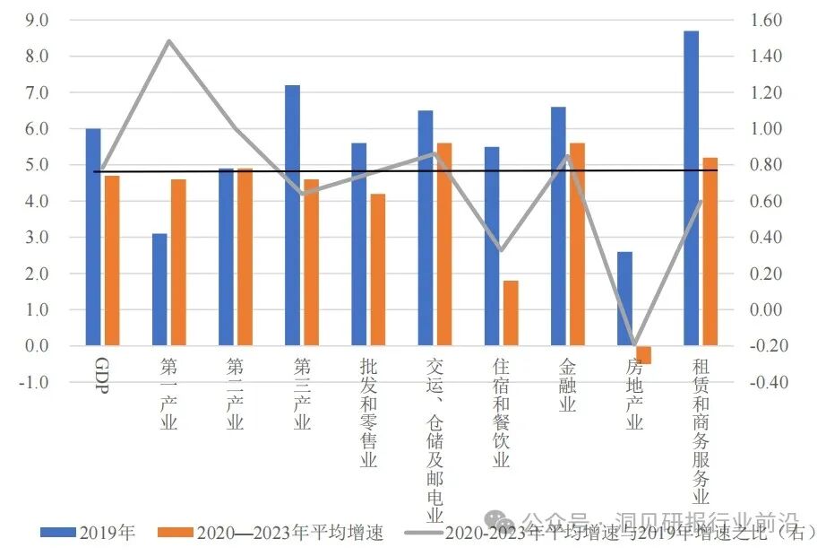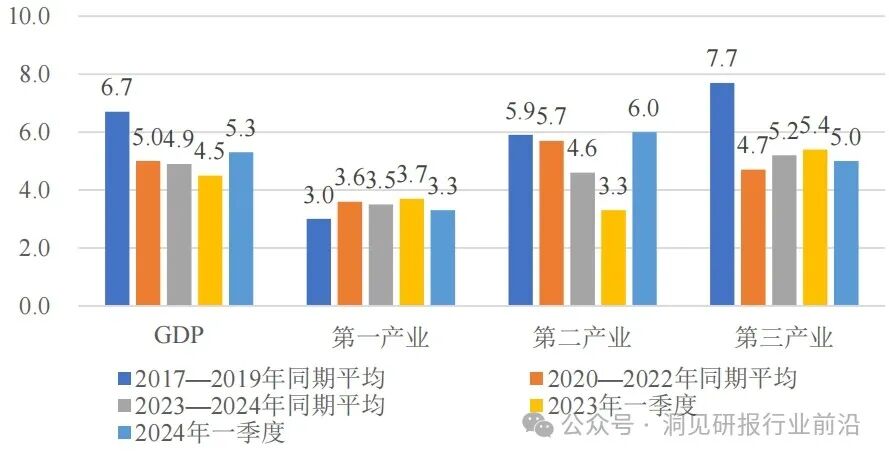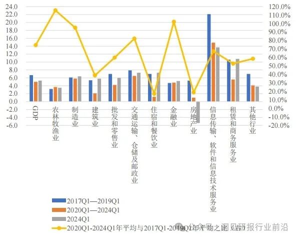 从各行业增长和恢复情况来看,虽然近两年一季度住宿和餐饮业、租赁和商务服务业、批发和零售业、建筑业平均增速较前三年同期出现了较大幅度上升,但自疫情暴发以来(2020~2024年)上述四个行业一季度同比平均增速分别为1.2%、5.6%、4.2%、2.1%,分别仅为2017~2019年同期平均增速的17.1%、52.8%、60.0%、38.9%。