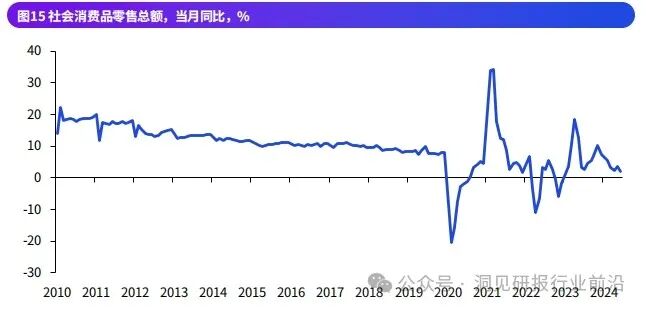 1-6月,社会消费品零售总额累计同比增长3.7%,低于去年同期4.5个百分点,较今年一季度回落1.0个百分点,与2022-2023年上半年两年平均增速持平。节奏上,二季度当季同比增长2.6%,较一季度回落2.1个百分点。
