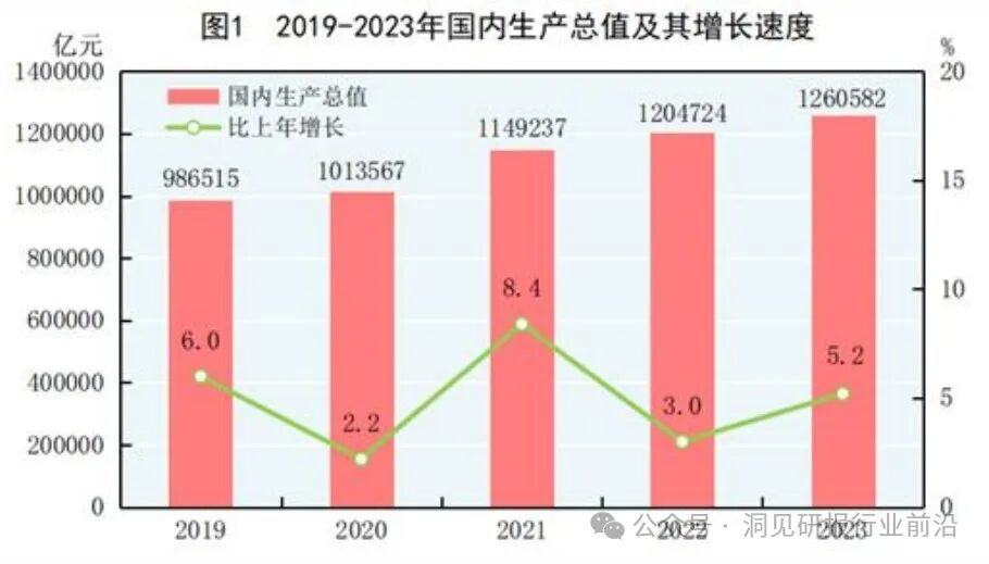 2023年,中国顶住外部压力、克服内部困难,经济总体回升向好,国内生产总值(GDP)超过126万亿元,按不变价格计算,比上年增长5.2%。
