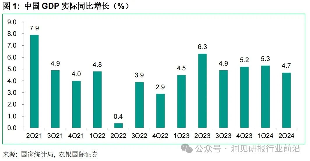 2024年二季度实际GDP同比增速达4.7%,较一季度下行0.6个百分点,季调环比仅达0.6%,低于市场预期。