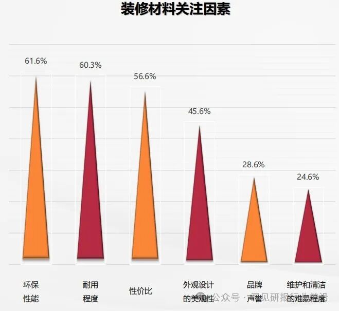 在选择装修材料时,环保、耐用、性价比分列一、二、三,都高于外观设计的美观性。