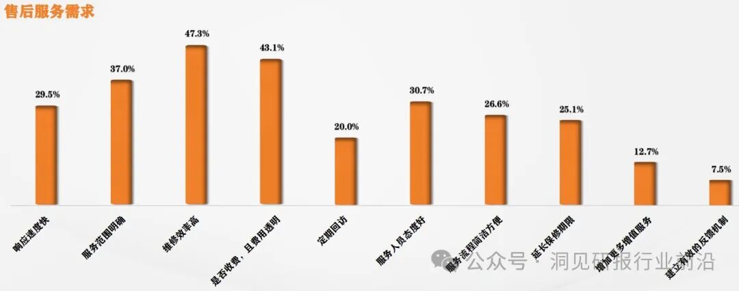 针对售后维度,维修效率高、是否收费且透明、服务范围明确、服务人员态度好、响应速度快是消费者更希望的前五位。对未来服务的期待,施工质量好、费用透明,无增项、施工过程更高效、服务态度更好、可供选择的产品更多是前五项。