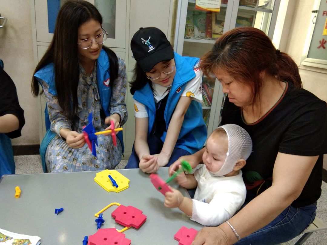 活动伊始,志愿者们帮助小朋友搭建玩具模型:小汽车、风车、手推车……随后,小朋友们和志愿者们开心地玩起了玩具。他们忘记了身上的疼痛,不时地发出“咔咔”的笑声。